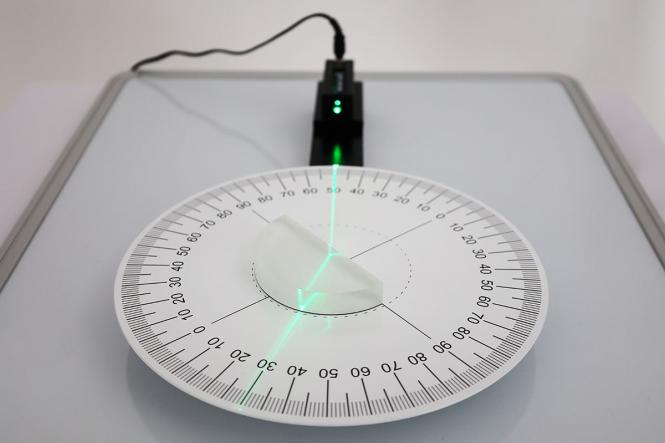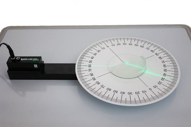 Als Lichtquelle dient eine 1-mW-Halbleiter-Laser-Line-Box mit einer Wellenlänge von 520 nm. Dank des kollimierten Laserstrahls werden die Brechungs- und Reflexionswinkel hervorragend dargestellt, sodass das Experiment sehr anschaulich ist und die Schüler die praktische Übung sehr einfach und schnell durchführen können.