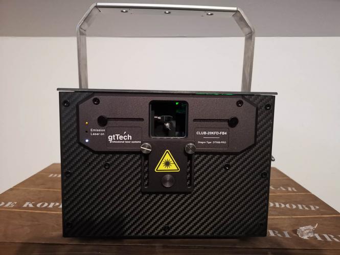Das sehr gut verarbeitete Gehäuse des Club-20KFD bietet an der Rückseite alle notwendigen Einstellungs- sowie Anschlussmöglichkeiten. Alle für den Laser relevanten Einstellungen (Setup, Safety, Farben, Automatik Modus, usw.) werden im Display vorgenommen. Anschlüsse wie Remote Not Aus in/out, Schlüsselschalter, DMX in/out, ILDA in/out, sowie eine Truss Sicherung sind Standard.